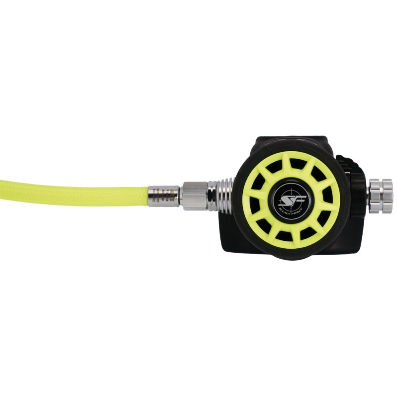 Black Devil Octopus- techniczny octopus automatu nurkowego stworzony przez prawdziwych nurków technicznych. Jest odpowiedzią na potrzeby nurków technicznych DIR oraz nurków rekreacyjnych szukających niezawodnego automatu nurkowego w najwyższej jakości wykonania, przy zachowaniu rozsądnej ceny. Octopus wykonany jest w całości z aluminium!!! Zastosowanie aluminium w całości zapewnia 100% wymianę ciepła cała powierzchnią drugiego stopnia tym samym zapewnia niewiarygodnie wysoki komfort oddychania ciepłym gazem oddechowym oraz zapewnia niespotykaną dotąd ochronę przed zamarzaniem. Zaopatrzony jest w pełną regulację oporów oddechowych oraz regulację efektu Venturiego. W celu podniesienia dodatkowo temperatury gazu oddechowego posiada wymiennik ciepła przy przyłączu wężyka Lp. Ponadto konstrukcja drugiego stopnia pozwala na użycie go w każdych warunkach, nawet w silnych prądach rzek czy oceanów bez efektu wzbudzania się czy zawieszania. Wyposażony jest w anatomiczny ustnik. Wyposażony jest w oryginalny wężyk Sflex, wykonanym z elastycznego oplotu kevlarowego w kolorze żółtym, który zapewnia maksymalną ochronę na uszkodzenia mechaniczne czy zwykłe przetarcia.