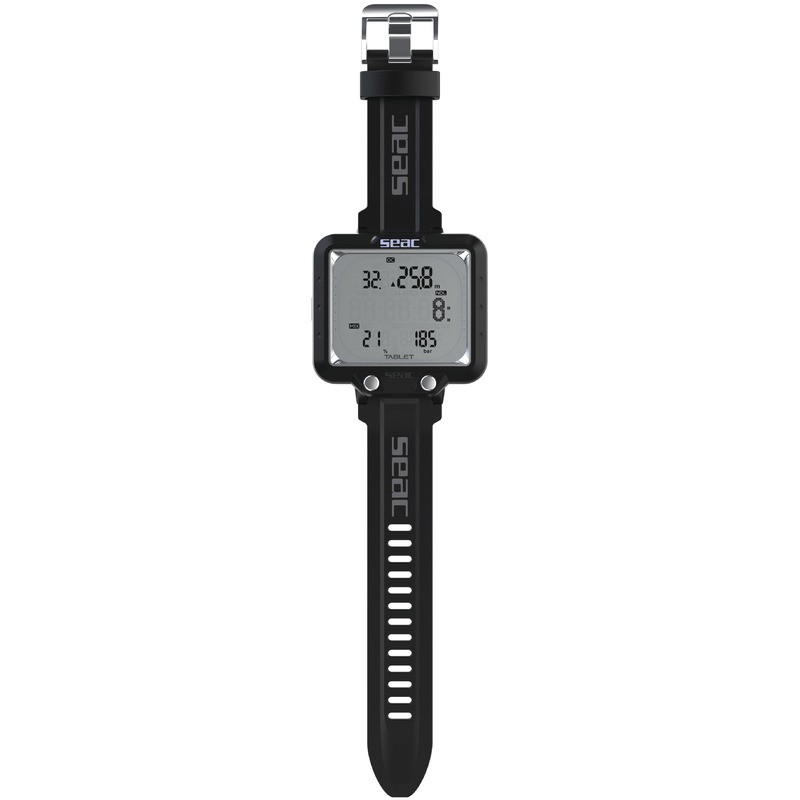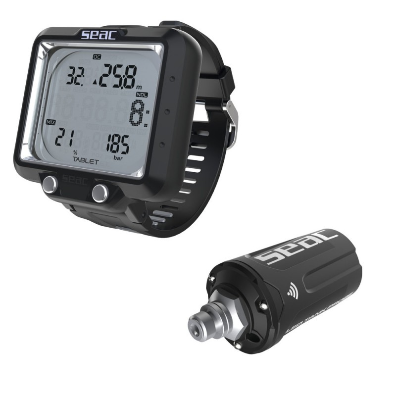 Seac Tablet to komputer na rękę, skierowany do nurków rekreacyjnych oraz technicznych. Obsługuje aż trzy różne gazy pod wodą- możliwość przełączania się pomiędzy gazami pod wodą. Można do niego podłączyć aż trzy transmitery (nadajniki) ciśnienia w butli i każdy nadajnik przypisać do innego gazu. Wyposażony jest w duży, bardzo czytelny wyświetlacz o doskonałym, regulowanym podświetleniu, stąd bez wątpienia nikt nie będzie miał problemu z odczytem wskazań. Posiada wielopoziomowy, realny algorytm nurkowań pojedynczych i powtórzeniowych z powietrzem oraz nitroksem (trzy gazy, O2 max do 99%)- Buhlmann ZHL-16C z sześcioma indywidualnymi poziomami ustawień, deepstopy, przystanki bezpieczeństwa, programowalne alarmy, wskaźnik ciśnienia gazu w butli, planer nurkowania NDL, temperatura wody, logbook, tryb nurkowania swobodnego oraz tryb gauge (przyrządu pomiarowego). Całość stanowi zgrabny komputer zamknięty w mocnej obudowie z tworzyw ABS, wyposażony w matrycowy wyświetlacz. Komunikacja z komputerem PC odbywa się bezprzewodowo przy pomocy Bluetooth, tym samym dostępne jest darmowe oprogramowanie na Windows i MAC. W zestawie posiada paski oraz gumy bungee do dowolnej konfiguracji mocowania na ręku czy dłoni. Komputer zasilany jest wymienną baterią CR2450. Tablet to doskonały, zaawansowany komputer nurkowy z funkcją odczytu ciśnienia z butli, obsługujący aż trzy różne gazy i trzy transmitery, wyposażony w jeden z najbardziej czytelnych wyświetlaczy! Doskonały dla każdego!
